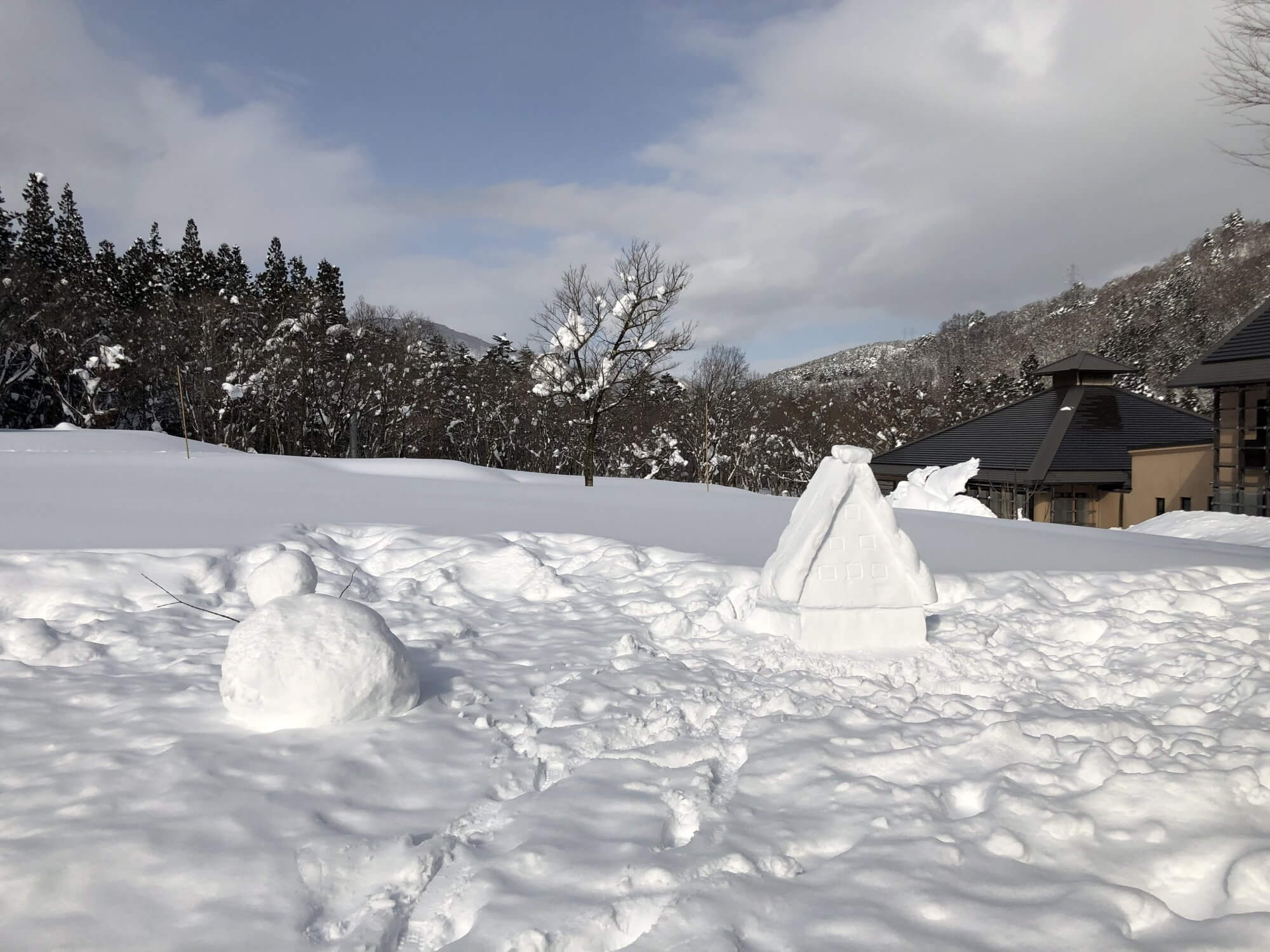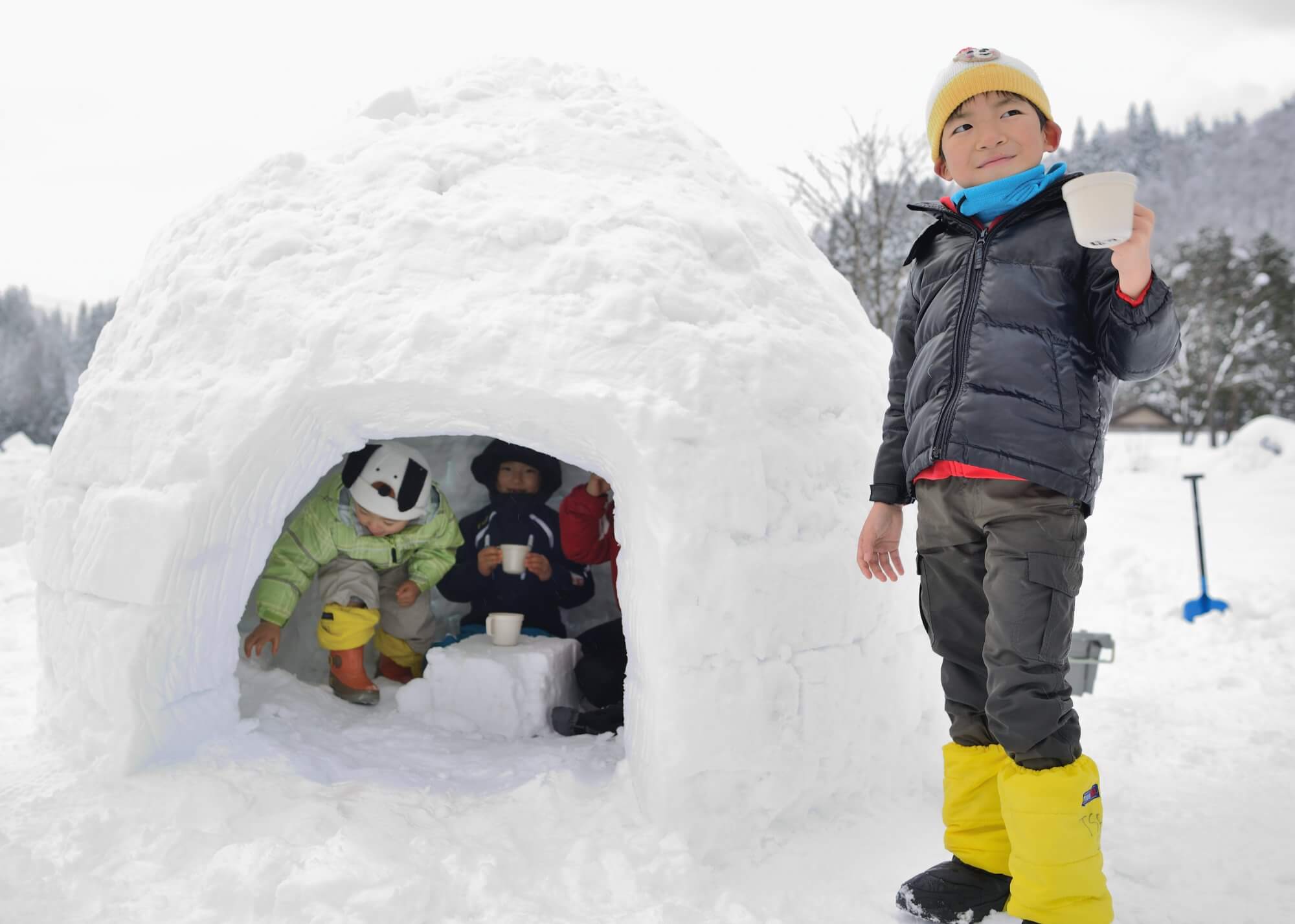 冬に自然學校に来たなら、雪で遊ばなくちゃ損!例年2m~3m程の雪が積もる自然學校の中庭に、思いっきり雪にまみれて遊べる雪遊び広場をご用意しています。建物から直接広場にすぐ出られるので、アクティビティに参加するにはちょっと大変な小さなお子様や、初めて雪にふれる方でも安心して活動できます。