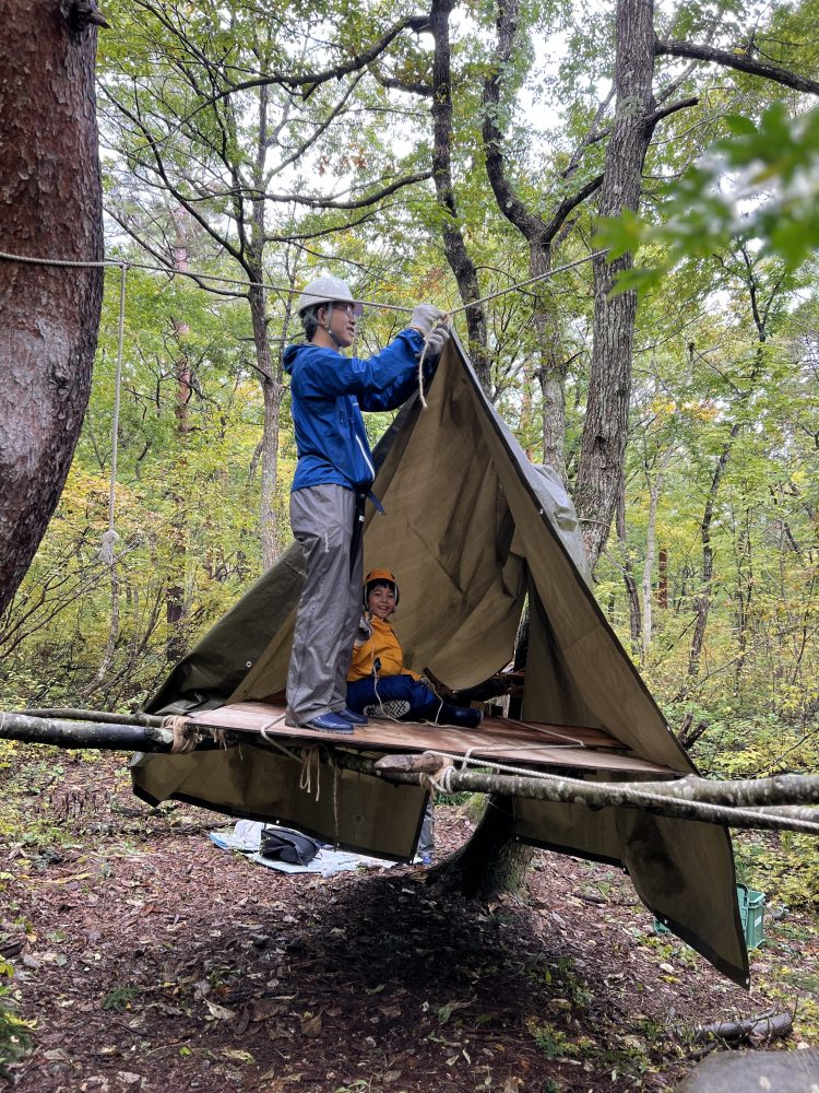 前回のGWに引き続き参加したが、前回の続きからできたことで、チップラインの製作に作業のほとんどをあてることができてよかったです。おかげで無謀とも思えた森の開拓や巨大はしご、ジップラインを完成させることができ、感動しました。子どもだけでなく親も楽しめた3日間でした。
