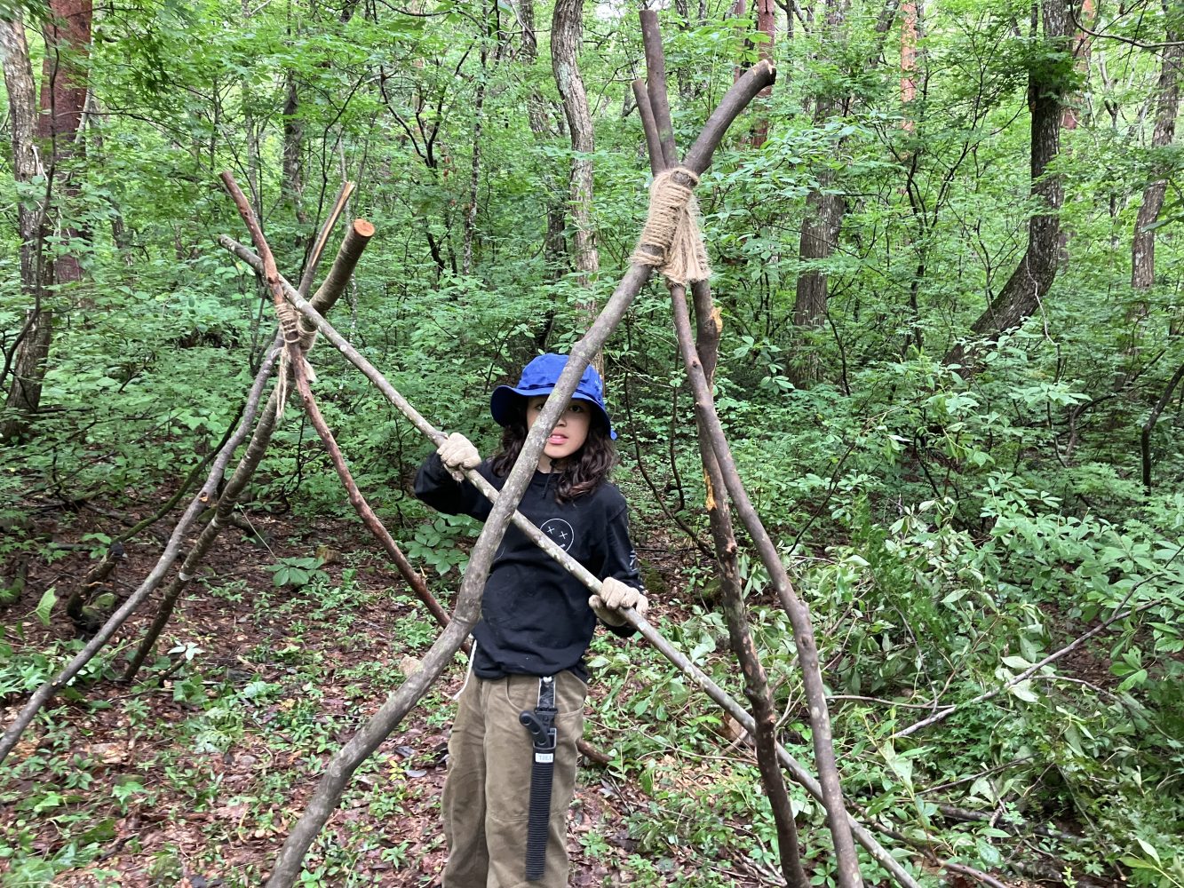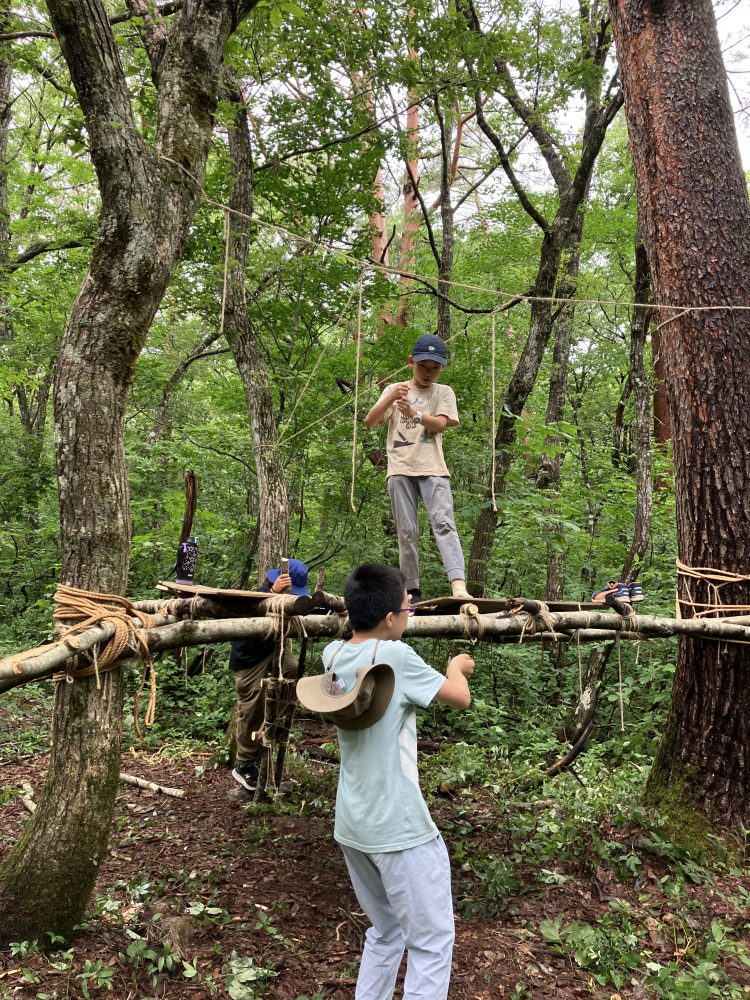 普段はどこに行ってもたいてい「自然を守るため木や枝を傷つけないで下さい」と言われるのに、ここでは自由に木を切って工作できるのが新鮮で貴重な体験でした。