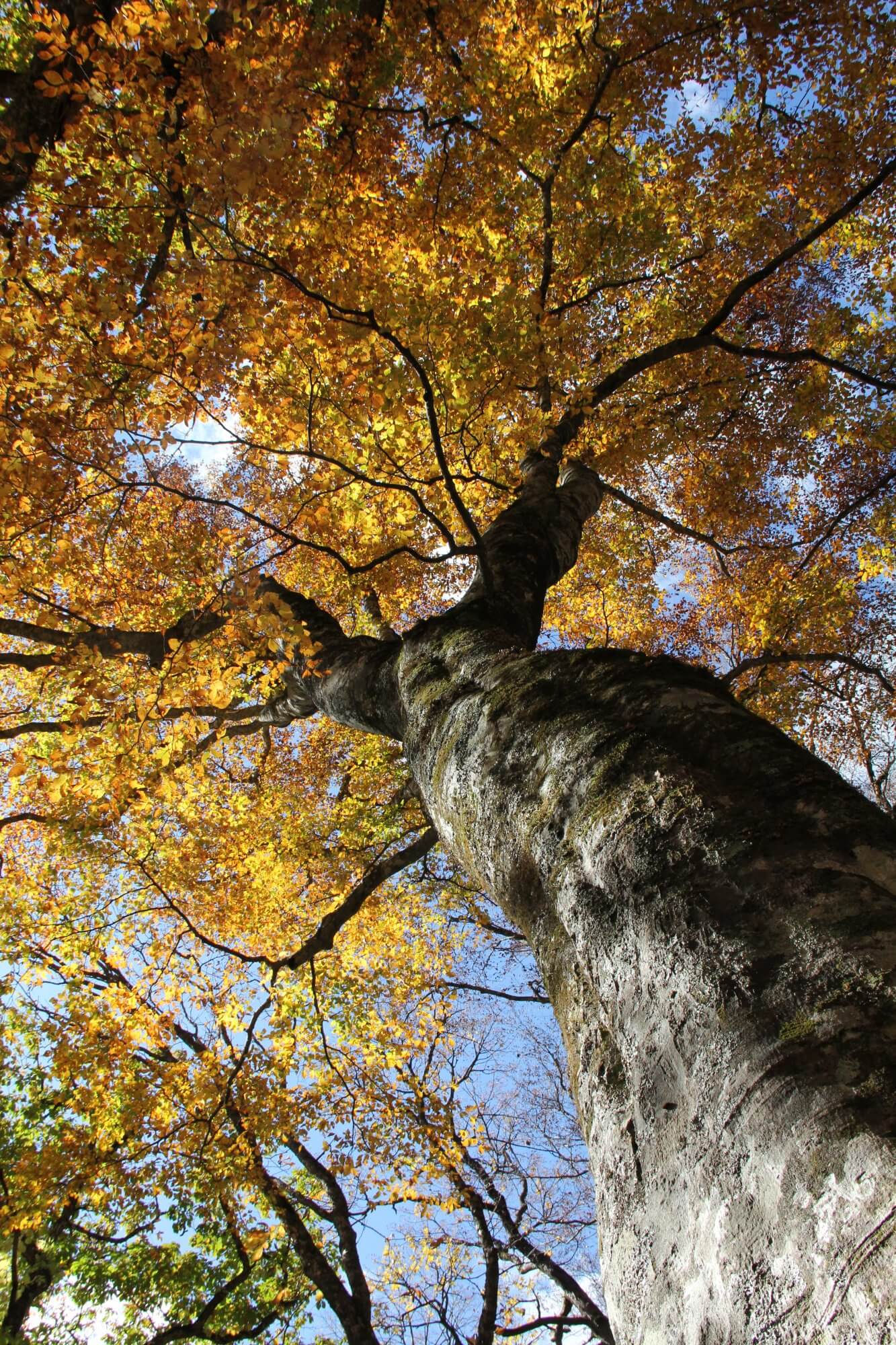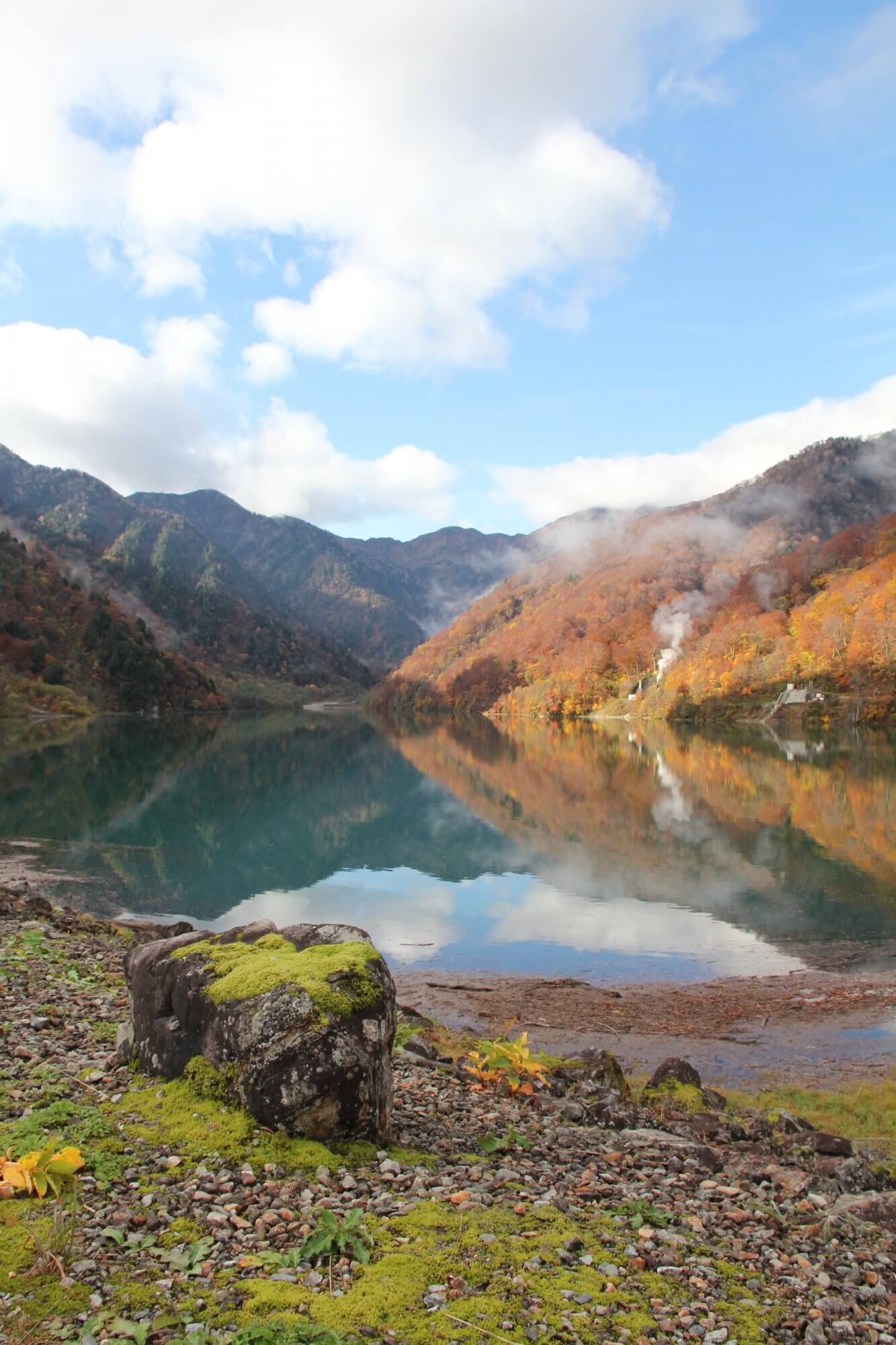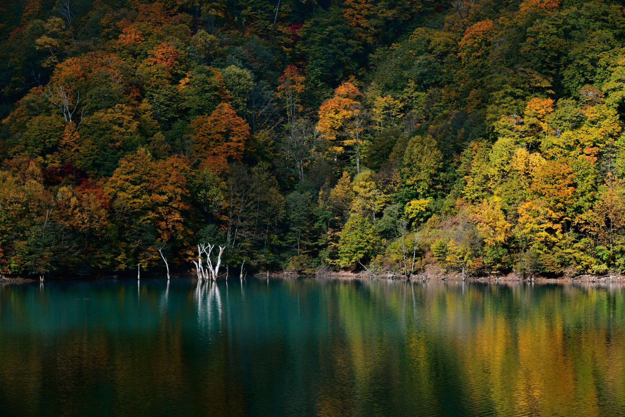 白川村の中でも、ひときわ山奥の大白川エリア。ここには樹齢300年クラスのブナの原生林が広がっています。ミズナラ、トチの巨木の森はすっかり紅葉して、頭の上から足元まで赤や黄色の葉っぱに包まれるでしょう。落ち葉の絨毯を踏みしめながらの視界の先は、冠雪の白山、白水の滝、それとも青緑の白水湖!?
