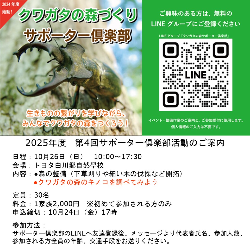 クワガタの森作りサポーター倶楽部では、定期的に森作り整備活動を実施しています。2025年度第4回整備活動を予定していますので、ぜひご参加ください。